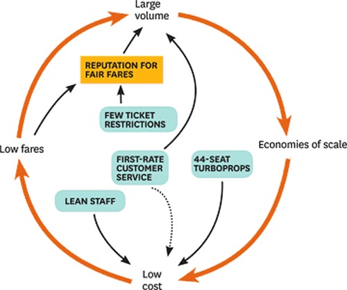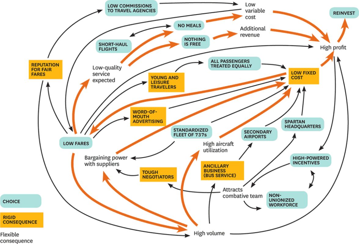 منطق جدید سازمان – روش آن برای خلق و جذب ارزش برای ذینفعان – مدل کسب و کار جدید Ryanair بود. استراتژی، هدف نهایی و مسیری بود که انتخاب شد؛ مدل کسب و کار، ابزار و نحوه پیادهسازی آن مسیر بود.