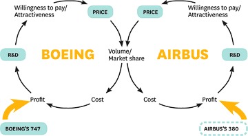 مثال: بوئینگ و ایرباس تا همین اواخر، بوئینگ و ایرباس اساساً با استفاده از چرخههای فضیلتآمیز یکسانی رقابت میکردند. ایرباس در هر بخش، محصولات بوئینگ را مطابقت میداد، تنها استثنا بخش حمل و نقل تجاری بسیار بزرگ بود که بوئینگ در سال ۱۹۶۹ هواپیمای ۷۴۷ را در آن عرضه کرده بود. با توجه به حجم ناهموار تقاضا برای هواپیما، ماهیت گرانقیمت آنها و چرخهای بودن صنعت، رقابت قیمتی شدید بود.